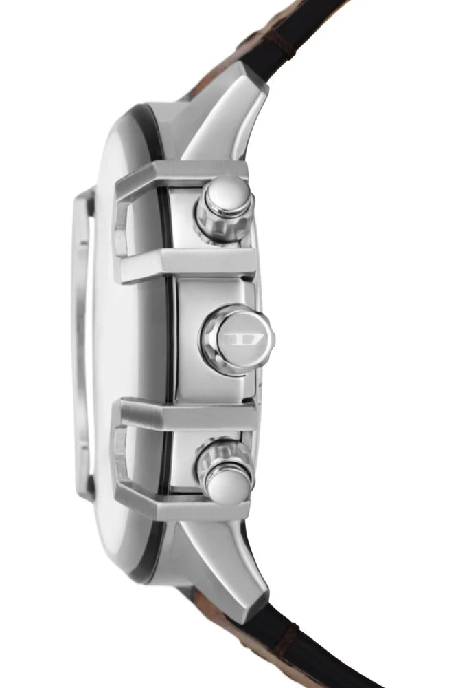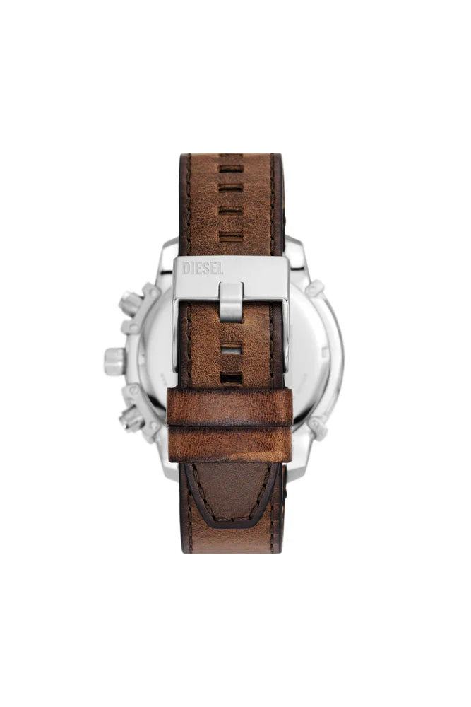 Diesel's 48mm Griffed watch features a blue sunray dial, chronograph movement and brown leather strap.