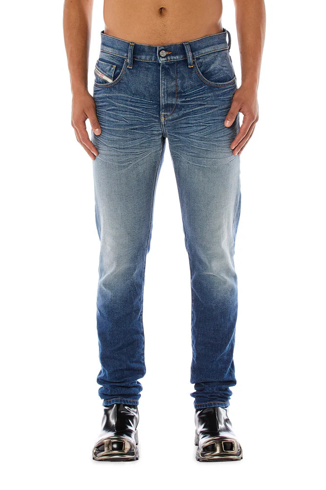 This comfort denim is made using partially recycled cotton. Reworking an archival DNA look, this medium blue wash showcases a contemporary interpretation of iconic Diesel crafstmanship: the whiskers are hand-sanded and stonewashed, then manually finished to enhance the bold 3D and visual effect.