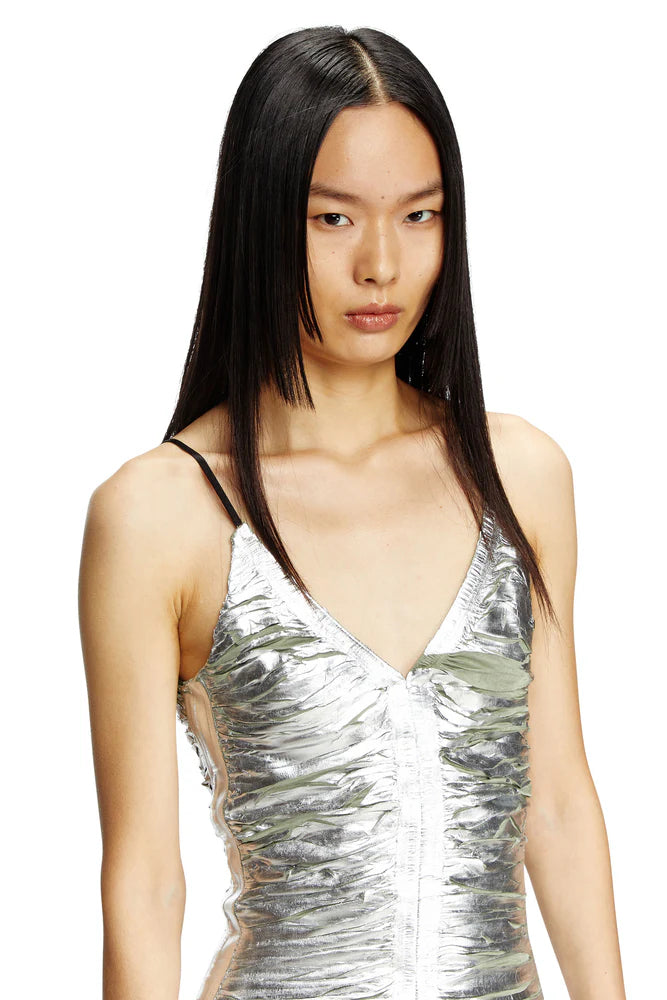 Jersey stretch women's mini dress is printed all over with high shine Mylar. The gathered fabric has an ultra glam look, enhanced by adjustable spaghetti straps at the shoulders. At the back, the undergarment is visible through strategic rips, and a metal oval D placket hangs from the right strap.